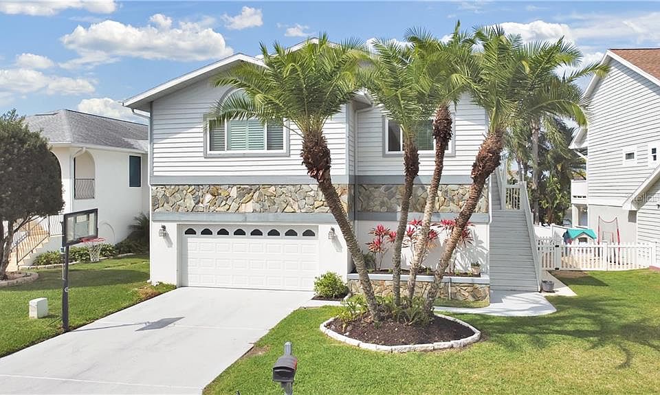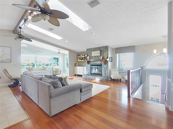 Extraordinary Waterfront Opportunity with Gulf Access! The Coveted Florida Lifestyle awaits you with this nearly 4200 sq/ft, 5 Bedroom, 4 Bath Gulf coast pool home. Located on a wide cove, this home offers one of the best waterfront views in the popular village of Sea Forest, and with seawall frontage and electric boatlift, it's equipped for quick and easy access to the gin clear turquoise waters of the Gulf of Mexico. Beautiful leaded glass double doors lead you to the spacious, contemporary, open living area featuring a great room with stone fireplace and Brazilian hardwood floors, and a sunroom with amazing panoramic water view. The spacious and inviting kitchen is perfect for family gatherings or entertaining guests, with stainless steel appliances, snack bar, stone backsplash and an abundance of cabinets and counter space, a walk-in pantry, large family dining area with water view, additional cabinets and built-in desk. The formal dining room and private wine room complete this level. One half level down is the enormous master bedroom with 2 walk-in closets and a private bath featuring double vanity, jetted tub, separate shower and linen cabinet. In addition, there are 2 large bedrooms with deep closets and a full bath. One floor down is the 4th Bedroom, 3rd bath, Large Laundry room with cabinets, folding counter & tub and a comfortable bonus room that leads to the screen enclosed lanai & outdoor kitchen with access to the pool, dock and covered entertaining area. On the ground floor is additional living area including the 5th bedroom, 4th bathroom and an office. This area could easily be transitioned to a Mother-in-law suite or private guest quarters. Everyone will appreciate the extra deep 670 sq/ft garage and adjoining 14'x28' workshop with storage galore. Don't miss the opportunity to enjoy the fabulous tropical lifestyle Florida offers at an exceptional price. Call today for a private showing.