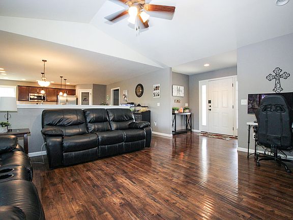 Nestled in Harvest View subdivision in charming downtown DeMotte, this stunning ranch home is move-in ready. With its delightful curb appeal and setting, you'll enjoy an unexpected level of privacy with a backyard that backs up to woods and cornfields. The covered rear patio offers a perfect spot for relaxation, no matter the weather. Step inside to a spacious open concept living area with durable laminate flooring throughout. The generously sized living room features cathedral ceilings, a cozy gas fireplace, and a built-in TV nook. The expansive eat-in kitchen boasts beautiful warm-toned cabinets, granite countertops, a modern backsplash, and a large corner pantry. The island with ample barstool seating is sure to be the heart of your home, ideal for creating countless memories and conversations. There's also plenty of room for a sizable kitchen table, with easy access to the rear porch. The huge main bedroom offers multiple furniture layout opportunities and an adjoining bathroom with dual sinks and a walk-in closet. Two additional bedrooms share a hallway bath, and the convenient laundry room off the kitchen includes a half bath for guests. The 3-car garage is a must-have, complemented by a large storage shed to keep it organized and decluttered. This home is a perfect blend of comfort, convenience, and style, waiting to welcome you!