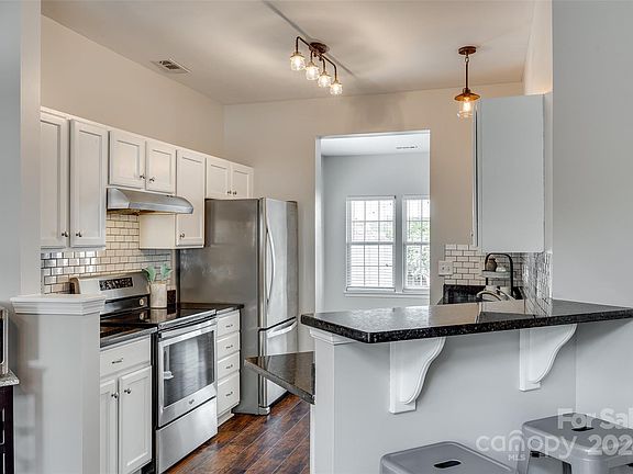 Adorable end unit townhome nestled amongst mature landscaping, street lights, sidewalks and picket fencing. Kitchen features granite countertops, tile backsplash, dining area and extra bar seating. Great room with ceiling fan and lots of natural light. The second level boasts two spacious bedrooms with private baths. Primary ensuite with large walk in closet and bath featuring shiplap accent wall and updated vanity. New paint throughout the home. Back patio has plenty of room for entertaining and enjoying the outdoors. Manchester Village features a community pool and clubhouse. Minutes away from I-77, shopping and restaurants.