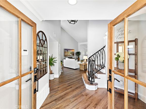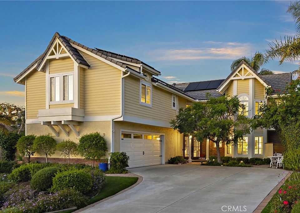 Lovingly coined "The Yellow House", this Mystic Hills custom home sits proud on a cul-de-sac, in San Clemente's sought after Coast District. Original character and storybook curb appeal, combined with tasteful upgrades throughout, give this home an elegant yet approachable vibe. This property is turn key and wants for nothing. Custom french oak front doors welcome you into the two story entry and great room just beyond. Thanks to the inviting volume, this large home lives open and airy, with direct access to the private and lush backyard from both the great room and separate den space. The kitchen is loaded with all of the necessary creature comforts and is full of natural light, with views into both the front yard from a darling breakfast nook and back yard from your kitchen sink window. The yard, with its mature and established plantings, buzzing with busy hummingbirds, water features and a 7 person spa, makes for a surprisingly low maintenance oasis. Also housed on the main floor is a bedroom adjacent to a 3/4 bath, laundry room and direct 2 car garage access. A stunning custom iron handrail hugs the stairs leading you to the 2nd floor offering a spacious Primary Suite, 2 more guest bedrooms, a guest bath and 2nd floor Living Room. This big upstairs Bonus room is really versatile and can be used as a playroom, office, gym, guest room or any combination of the 2. This is the kind of living space we're all looking for and while the home lives large it maintains a cozy compartmentalization-offering everyone a place and a space. Fully remodeled in 2019 throughout, the finishes show a quality of craftsmanship and high taste level in this lovingly maintained property. The current owners have continued upgrading while enjoying the hard work of the previous owners extensive remodel, eliminating a sunken living room by leveling the floors on the first floor, adding solar panels, an EV charging station and installing a 7 person Fresh Water Salt System Spa in the back yard. Come experience this property in person to fully appreciate its elevated feel and design.