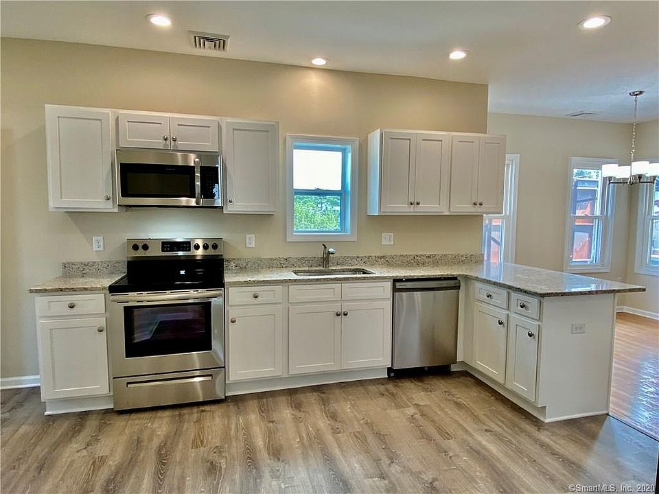 Completely remodeled! Not a surface untouched! Beautifully done, 2nd floor ranch style apartment with 2 bedrooms and 1 full bath. This is a large open concept unit with 9 ft. ceilings and lots of windows that provide and open and airy feel! Brand new kitchen and granite countertops with all new appliances. Brand new wood flooring throughout, freshly painted and in-unit laundry! Conveniently located to highways, restaurants and shops!! Owner/agent