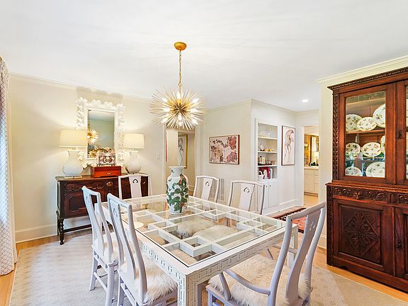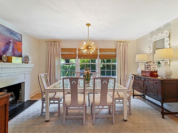 The light-filled dining room offers an inviting space for gatherings, while the living room flows seamlessly into the kitchen and showcases custom built-ins and a wood-burning fireplace, perfect for entertaining or cozy nights in.
