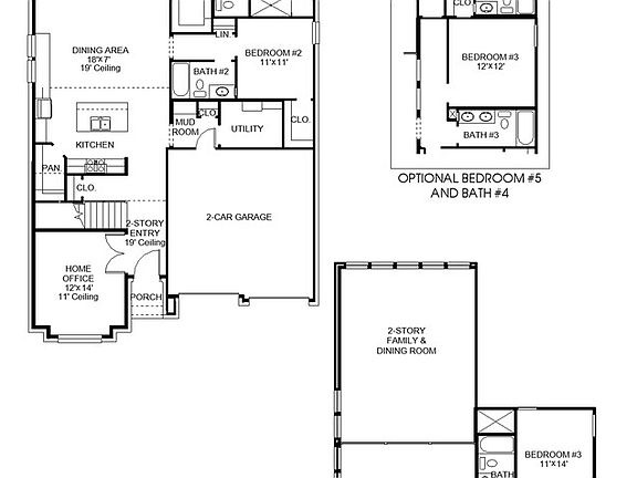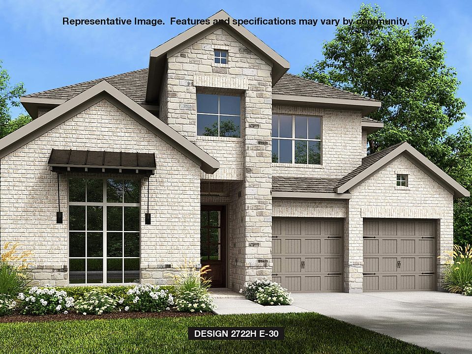 Home office with French doors set at two-story entry. Open kitchen offers deep walk-in pantry and generous island with built-in seating space. Dining area opens to two-story family room with wall of windows. Primary suite with 10-foot ceiling. Dual vanities, garden tub, separate glass-enclosed shower and large walk-in closet in primary bath. A second bedroom is downstairs. A game room and secondary bedrooms are upstairs. Covered backyard patio. Mud room off two-car garage.
