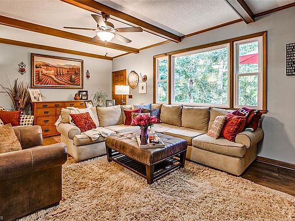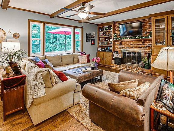 Beautifully updated brick ranch! Spacious open floor plan with tons of updates including some new interior & exterior paint, gutters, windows, some new exterior lighting, new well pump & new LVP flooring. Den has hardwoods, exposed beams, built-in shelving & fireplace. Updated kitchen with LVP floor, new counters & backsplash. All appliances remain including refrigerator. Nice master suite with parquet floors, double vanity & shower. Huge finished basement rec room with fireplace, kitchen with all appliances remaining, eat-at island, bonus room & full bath. Unfinished basement area has garage door & work bench. New deck overlooking the private back yard. Welcoming front porch, patio, paved drive & open ended double garage.