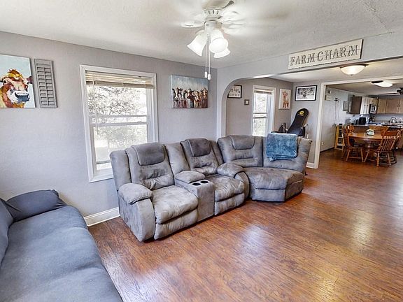 Updated home in Quinter KS boasting 2 bedrooms and 1.5 bathrooms. This home has undergone several renovations in recent years, and features fresh paint and updated flooring throughout as well as vinyl windows, new roof, and vinyl siding. The kitchen has been updated with beautiful solid surface countertops, cabinets, and stainless-steel appliances. The bathroom has a nice his and hers double sink vanity, modern black linen cabinetry, and both a corner whirlpool tub and a walk-in shower. You will enjoy the inviting living room with large windows that let in plenty of natural light while the oversized laundry room is an added bonus and currently doubles as office space. A partial basement offers extra storage space which always comes in handy!! The property also features a detached garage providing plenty of space for storage or potential as a workshop. The large backyard is enclosed by a privacy fence and provides a safe place for the pets to play. This home is move-in ready and waiting for you to make it your own. Schedule your showing today by calling Trevyn Wolf @ 785.422.5155. Under contract. Please bring backup offers..