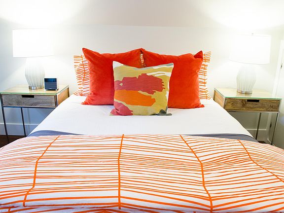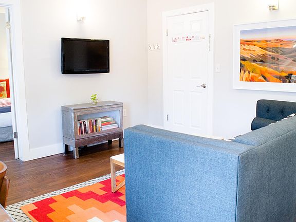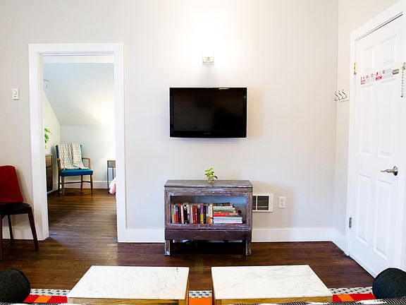 This suite is a two-bedroom appealing upstairs unit with exposed brick adding to its charm. It has a separate living area, a galley kitchen with meal prep essentials, and a private bathroom (shower only). There is a Queen bed in the main bedroom and two futons in the smaller bedroom. Bathroom access through the main bedroom. Available for nightly, weekly or monthly rental. Utilities, and internet. Free laundry facilities. Cleanings are available for $35 a week.