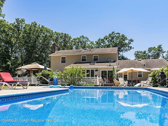 Meander down a tree-lined winding driveway to this custom-built 4 Bedroom, 2 1/2 bath home with an oversized two-car garage nestled in the woods on two acres with proximity to Bass River State Forest and walking distance to Pinelands Middle School. Sit back in a rocking chair on the front porch overlooking established plants, trees and shrubs and a circular stoned driveway and enjoy the sights and sounds of nature and an occasional deer! Enter the front door to a traditional Colonial with a foyer and formal living room and dining room to the right and left featuring glistening wood floors. The focal point of the living room is the stone fireplace with stones from Tuckerton's original schoolhouse! The kitchen is a chef's dream. Remodeled in 2017, the many features include stainless steel appliances, granite countertops with a leathered look, a farmhouse sink, double ovens, under counter microwave, a cook-top with a pot filler, under-counter lighting, and a wine bar and refrigerator. Conveniently off the kitchen is the laundry room with a matching front-loading washer and dryer and a half bath. An all-season sun porch is a perfect gathering room for the family with a large flat-screen TV and views of the gigantic backyard. Take the stairs to four good-sized bedrooms and a full hall bath. The primary bedroom has a walk-in cedar closet and a luxurious, spacious bath with a double sink and a walk-in rainfall shower. The hall bath has a soaking tub and shower. The large rear deck with a canopied gazebo is a perfect location for grilling and outdoor dining. It overlooks a generous-sized inground, L-shaped heated pool with a privacy fence. A pool house shed and two garden sheds provide lots of storage space. Adding to the backyard ambiance is a Zen-like oasis with a little bridge crossing over a babbling stream, a fishpond, a waterfall and a fire pit. Beyond the pool is a huge, cleared area suitable for many things including room for an RV (50 amp outside service provided), contractor's equipment and room for a tennis or basketball court! The full basement was once an active recreational area and includes an 8' foot slate-topped pool table. The amenities list is attached to the listing.