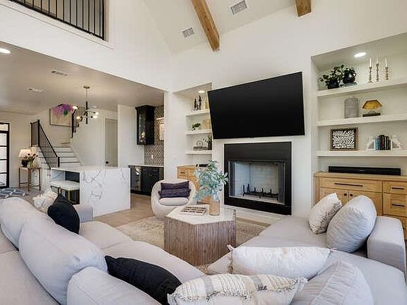 - Bar, Beamed Ceilings, Bookcases, Built-in Features, Cathedral Ceiling(s), Ceiling Fan(s), Chandelier, Double Vanity, Dry Bar, Eat-in Kitchen, Entrance Foyer, Exhaust Fan, Gas Dryer Hookup, High Speed Internet, Interior Steps, Kitchen Island, Multiple Living Areas, Open Floorplan, Pantry, Primary Bedroom on Main, Quartz Counters, Recessed Lighting, Smart Thermostat, View, WD Hookup, Walk-In Closet(s), Washer Hookup, Wired for Sound