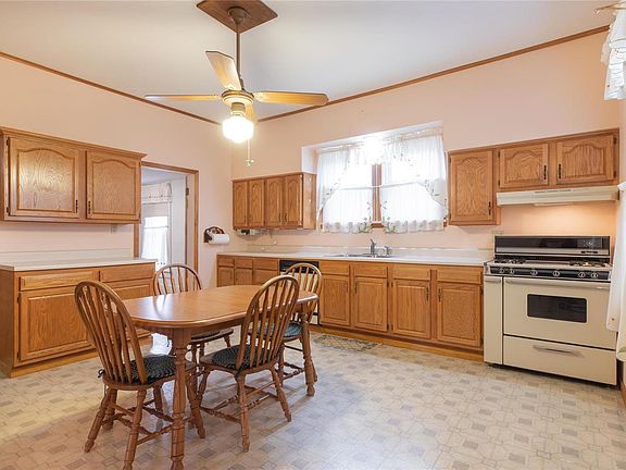 Why rent when you can buy! This 2 bedroom 1 bath home features a large eat in kitchen with plenty of cabinets, main floor laundry area, large living room, 2 large bedrooms, corner lot, covered front porch, deck, partial basement, oversized 2 car detached garage, and situated on a corner lot.
