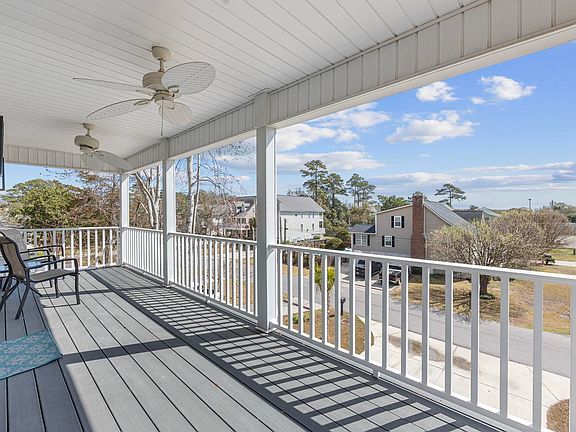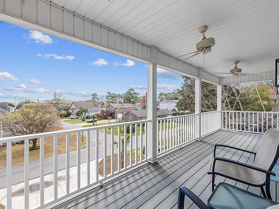 Relax and breathe in that healing salt air from this like new, (built in 2022), 4 bedroom, 4.5 bath home only 3 blocks to the Beach! Home has 2 large EAST-facing covered porches (with ceiling fans) and yes, you can see a little bit of blue/ the ocean from the Upper Porch! Enjoy the Beautiful and Expansive Layout in this Immaculate home boasting a huge living room with dual ceiling fans, 3 large Primary/Master Bedrooms (1 down and 2 up) with spacious ensuites and large walk-in closets (one of which opens to the private, upper covered porch) plus a 4th Bedroom with private bath and closet! Gorgeous granite countertops and high-end, waterproof LVP flooring throughout this amazing home! Updated, modern kitchen with Pantry, Custom Slow-Close Cabinetry, Stainless Steel appliances, large Granite Island and very spacious dining area as well. 2nd floor has a large additional hall closet space to store whatever you need. Home has a very nice laundry room with extra closet, half bath and white Maytag, large capacity, commercial technology washer/dryer! Attached exterior storage room that can be accessed at the base of the interior steps or from outside. Detached storage shed with electric & large enough to store a golf cart! Exterior of home has large gutters with gutter guards! Exterior has high-end Vinyl Shakes and siding. Also has ample parking with room for 6 cars in driveway and as many as 3 under the home. **Not required to have flood insurance here! NO short term rentals allowed due to town ordinance. Don't miss this one- you'll kick yourself later!