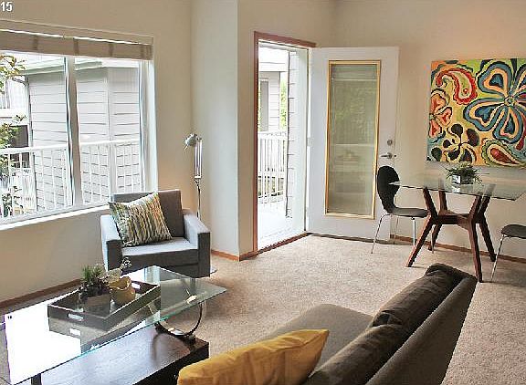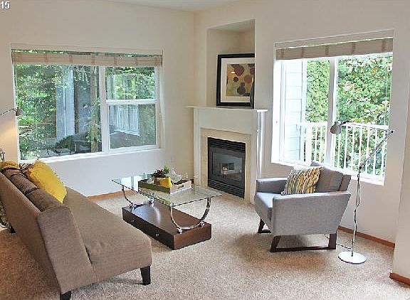 Awesome location in John's landing-Walk to shops, restaurants, cafes, Zupans, trail into Portland, Willamette Park! Condo is private & quiet w/trees outside all windows. Open Floor Plan-Great room has fireplace,picture windows, french door to deck, eating bar and room for table! Large bedroom w/big picture window looking out at trees, huge bathroom, New carpet-Paint. Full washer-Dryer-Secure garage-bike rack-Elevator-grass area for pets