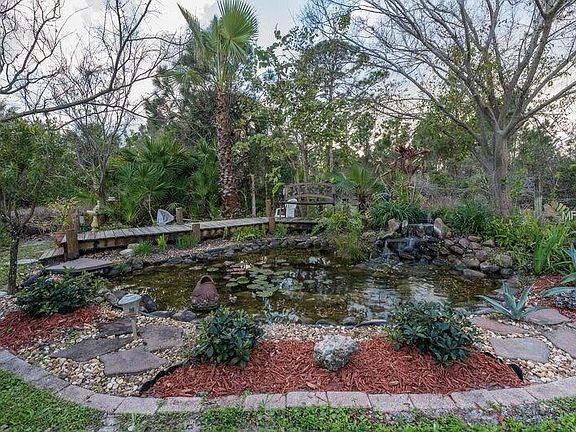 Such an AMAZING home that just exudes tranquility from the entrance to the rear of the property! As you walk to the entryway you cannot miss the gorgeous tropical landscaped lot with a beautiful front garden and large fountain. This 1 owner, custom built, 3 bedroom, 2 bath is immaculate and very well maintained! As you open up the double entry front doors, this open floor plan makes it so inviting! Large formal living room and dining room, kitchen w/stainless appliances, island and breakfast bar overlook the family room which makes this the place to entertain all of your guests. Separate breakfast nook has a wonderful aquarium window for those kick back morning coffee's. Oversized master bedroom offers a sitting area and walk-in closets. The master bath has a roman walk-in shower and Jacuzzi 4 jet heated garden tub. If you open up the sliders to bring the outside in, you will hear the peaceful sound of a cascading waterfall, overlook the Koi pond and boardwalk which has a bench and lights, surrounded by additional tropical landscaping. Garage was extended 4 ft. to allow for a boat and the shed in the back has electric and lights. New Updates in 2017 include, 3 1/2 ton AC, exterior and interior have been painted, carpet and padding in the bedrooms, overhead garage door springs, pond pump, irrigation control box, front light fixtures and front door lockset and more....the entire home has been re-plumed. Such a great location and backing up to a preserve makes this a home you do not want to miss!