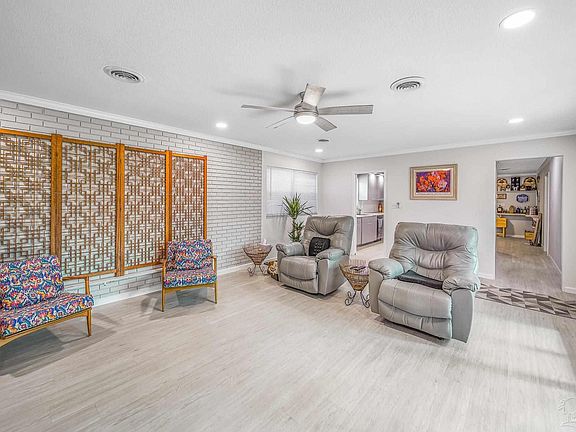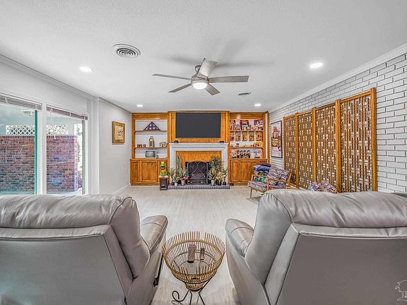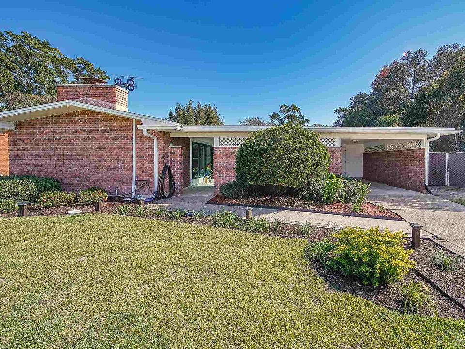 Beautiful mid-century home in Scenic Heights! This amazing property was recently renovated with a new roof, new plumbing, and an updated interior making it totally move-in ready. Walking up, you're greeted with pristine landscaping and a unique courtyard leading to the main entrance. This house is one of only a few in the subdivision that features a front courtyard which creates such a welcoming setting and the perfect place for lounge chairs. Inside has a semi-open floorplan connected by neutral tones and brand new LVP floors. Much of the mid-century character has been maintained in the living area like the built in shelves surrounding the fireplace, picture windows, and an exposed brick wall, but fresh paint and updated lighting/hardware has helped to modernize the space. The kitchen offers similar updates like sleek gray cabinetry and stylish hardware, as well as a subway tile backsplash with a mosaic inlay. Off the kitchen is the dining area and sliding doors to the heated and cooled Florida room that provides an additional 440 sqft of living space! All three bedrooms are situated on the opposite side of the home. The guest bedrooms have ample closet space and share a remodeled hall bath with gorgeous tile work and modern finishes. The primary bedroom has two closets and its own ensuite bath with a standing shower and pedestal sink. Although the interior is spectacular, the backyard and surrounding property is a true gem. Not only is there lush landscaping and greenery, but a large patio to enjoy it from plus multiple spaces for storage.There's an insulated shed with full power and a window a/c unit, and off the driveway is a double gate that leads to the RV parking pad which has 30 amp electric service and place to hook up to the sewer!! You won't want to miss this one!