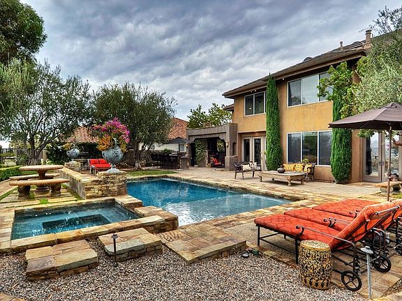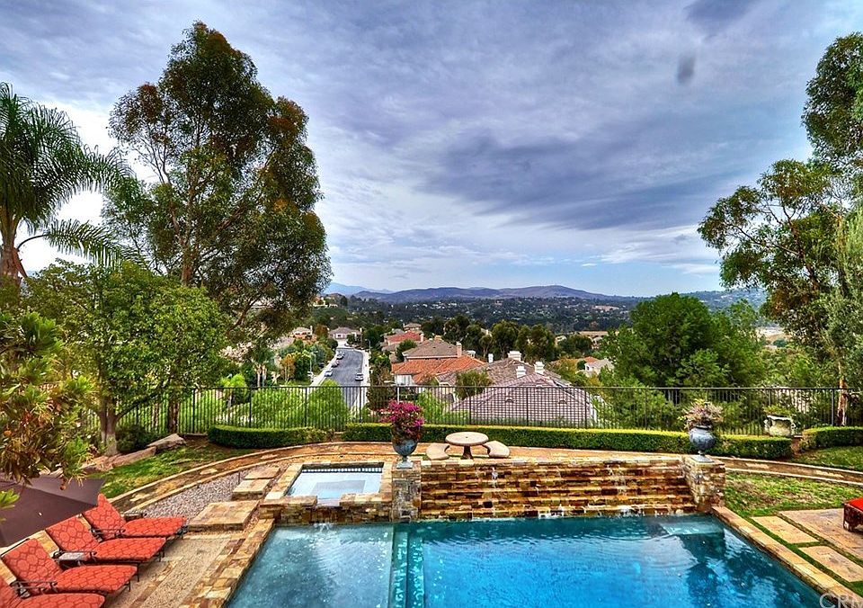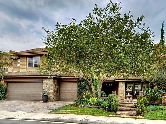 One of the original Estate Models,this stunningly upgraded home in the gated, highly sought after Parkridge community is set amidst the backdrop of Spectacular views of treetops, rolling hills & fireworks . Upon entry into the foyer with 19-foot ceilings and sweeping staircase, French doors with glass side panels showcase views to the horizon and resort-style exterior which holds an inviting pool, spa, stone waterfall, expansive stone patio and lush landscaping. An outdoor kitchen includes a built-in barbecue, stone bar with seating for 8+, solid covered cabana with stone flooring, fireplace, hearth and TV ensuring there will never be a shortage of entertainment. The living and family rooms each enjoy a warming fireplace & views to the horizon. French doors offer access to the patio and cabana from the formal dining room fostering a seamless flow for ease in entertaining. The kitchen includes top-of-the-line GE appliances, white cabinetry, granite counters & backsplash, island and eat-in area. A main floor bedroom with en-suite bath perfectly suits guests or in-laws. An ascent to the second floor reveals two bedrooms sharing a Jack & Jill bath, a third bedroom with private en-suite, and master retreat with fireplace, sitting area from which to enjoy endless sunsets, and en-suite bath. Parkridge amenities include a pool, spa, sport court, picnic areas, nearby parks & riding trails. Low HOA dues, no Mello Roos. In attendance of California Distinguished Villa Park schools.