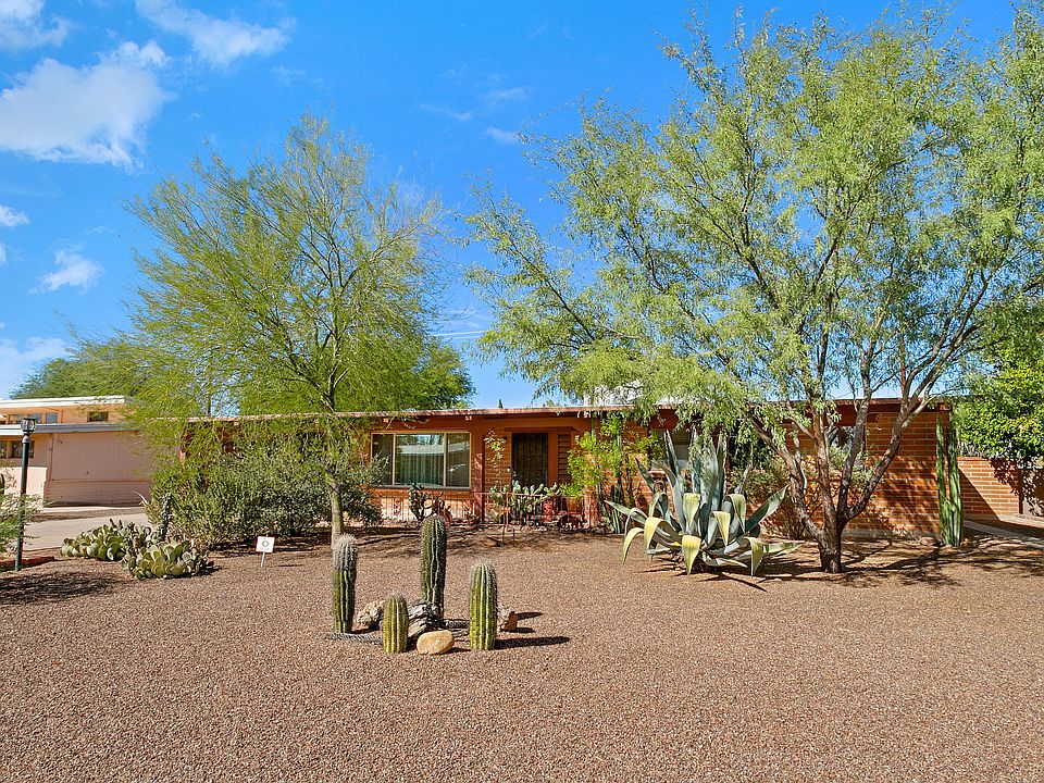 * Privately situated burnt adobe Mid-Century home, full of charm. Vaulted tongue and groove beamed ceiling throughout the entire home. Large windows allowing lots of natural light. Large format neutral ceramic tile throughout living areas and wood laminate in bedrooms - no carpet. Recently updated kitchen with SS appliances, newer countertops with tile backsplash. Spacious bedrooms w/en suite owner's bath with new tiled shower and fixtures. Separate laundry room with washer and dryer and charming screened in porch at back. Many native plants and gardens in pool size back yard. This is truly an in town oasis, not to be missed!