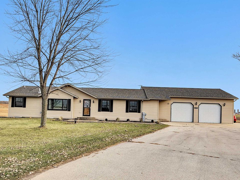 Beautiful updated open concept ranch style home with miles of country views but only a short drive from town. Extra wide driveway and parking apron on side of garage. Living room features high end efficient wood fireplace and cathedral ceiling. Spacious kitchen dinette with shiplap walls. Updated kitchen appliances 2021. Master suite boasts walk-in closet and full private bath with shower and whirlpool tub. 1st floor laundry mud room. Fully finished walk out lower level with larger rec room, family room and den/office area. Stairwell from lower level to garage as well. Also note New A/C 2017, New windows main level 2022, New landscaping 2022, Shiplap added to kitchen and laundry areas 2019.
