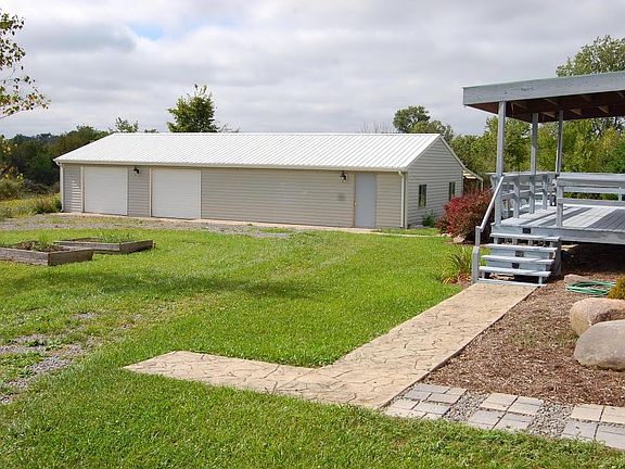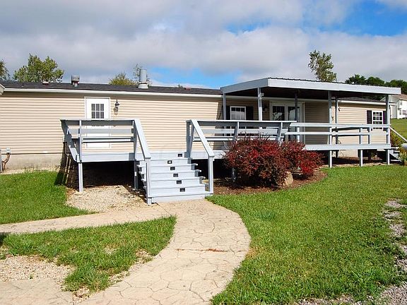 Nice manufactured home on 5 beautiful rolling acres. 56'x36' outbuilding with electric and concrete. Exceptionally large deck with covered area. Great room with island kitchen and a fireplace. Split bedroom design. New roof, stove and refrigerator, well pump/pressure switch. New paint and some new flooring.