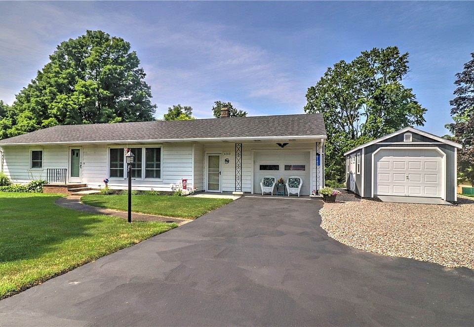 Welcome to 6143 Court St! This lovingly maintained home in the Union Springs school district, is a hidden gem you won't want to miss! It's got everything you need for comfortable living, plus some extra perks that make it truly special. Two bedrooms, one bath, and a spacious 1,467 square feet provide room to spread out. The full basement offers tons of storage or potential for additional living space. Stay cozy year-round with multiple heating options: natural gas forced air, central air, a wood stove, electric baseboard, and mini-split in the attached garage. Not to mention, all mechanicals have been recently updated! You'll love the Plantation blinds and gorgeous wood floors that add warmth and character throughout. The outside boasts a paved driveway,raised bed gardens, and two sheds – a 10x16 garden shed with lean-tos and a 10x20 garage shed – for all your storage needs! A brand new 30-year roof, newer appliances, and energy-efficient windows with plantation blinds are just a few of the updates that make this home move-in ready. Honestly, there's too much to describe – you've got to see it for yourself!