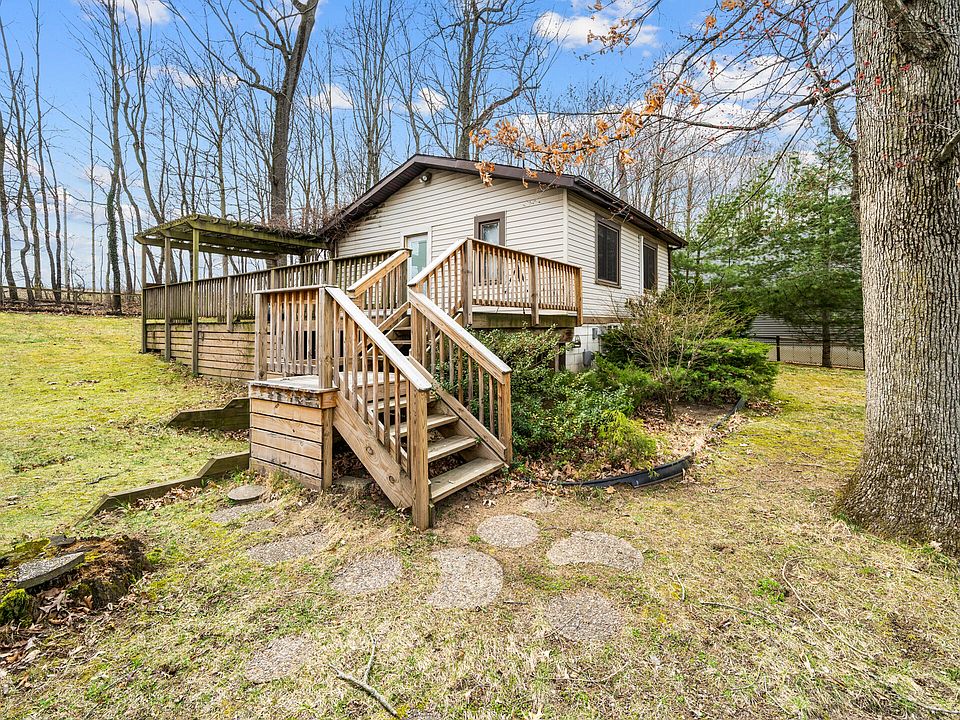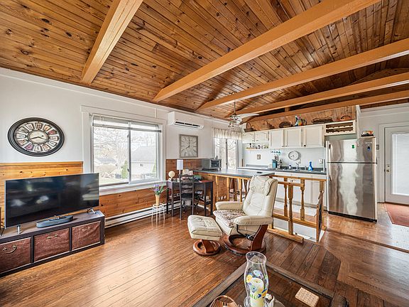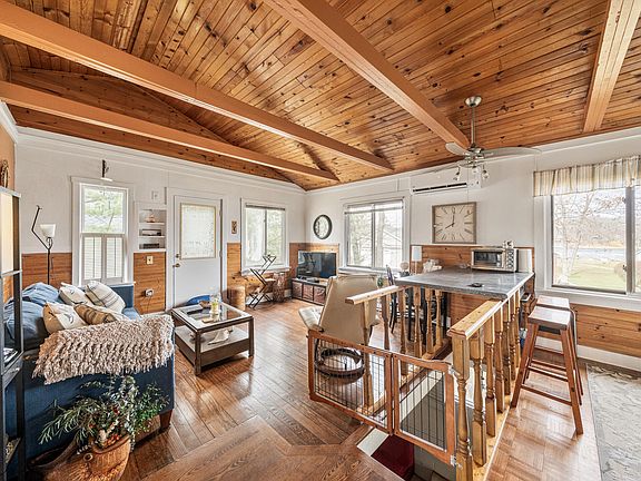 The warmth of the hardwood flooring and vaulted knotty pine ceilings offer a cozy cabin feel to this year-round cottage. The entire yard is fenced in. You will love the 2-car detached garage/pole barn with electricity. Enjoy Country living of the finest with beautiful lake views surrounded by hundreds of acres of land and water. City water is available on the street cost of $252.00 annually added to the winter tax bill. Home has a well. The Realtor is related to the seller.