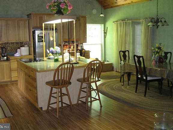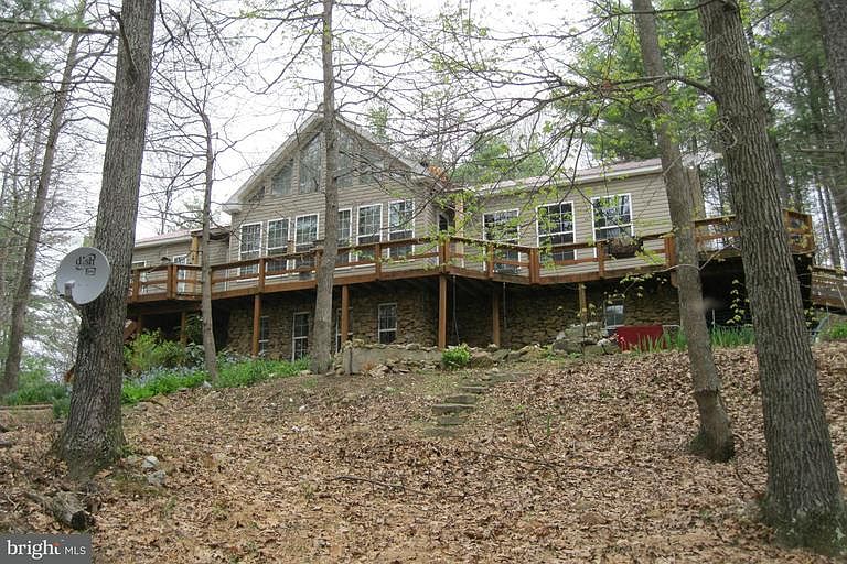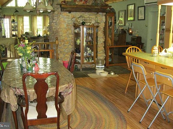 Large Chalet, 2100 sq. ft. open floor plan, with vaulted ceilings and huge fireplace+ 2000 sq. ft. Art studio/ceramic shop/gallery on first floor. House is hidden in woods, half mile paved driveway. Dual Heat System. 38+ acres, 30 wooded,8 rolling fields and horse barn. Good road frontage close to MD. Large 3 bay auto shop with lift and full bath. Also other out buildings for storage.