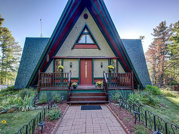 Discover your lakeside paradise with this breathtaking custom-built, double A-frame home on stunning Kildare Lake. This 1-of-a-kind retreat is the perfect blend of luxury and nature. From the eye-catching curved staircases to 2 cozy wood-burning fireplaces, every detail impresses. Relax on the expansive deck with jaw-dropping views or unwind in the private sauna. The main level offers a serene primary suite, a gourmet kitchen, and a half bath. Upstairs, two charming bedrooms and a full bath await. The walkout basement features 2 bedrooms, a hot tub, sauna, and a unique round fireplace, bringing lakeside living to new heights. Just steps from the water, this oasis includes an 8-car garage, private boat landing, and another 5-acre lake lot. Buyer to confirm measurements.