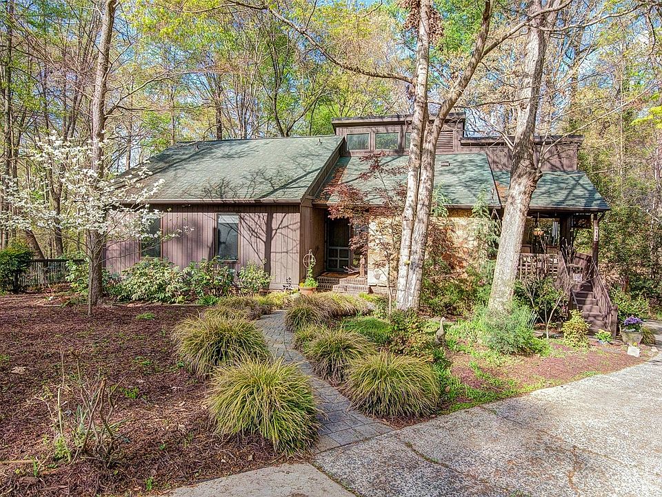 Escape the hustle and bustle and feel like you have been transported to the mountains, but right in the heart of South Charlotte! Cabin-like setting on cul-de-sac lot, beautifully landscaped w/gardens & private wooded area in back. Primary bedroom suite has vaulted ceilings, skylight w/remote shade, hardwood floors & double sliding glass doors to deck. Large primary bathroom has heated tile floors w/heart of pine vanity & tub skirt, vaulted ceiling, skylight & walk in shower. Two additional bedrooms and full bath on main. All white kitchen w/stainless appliances & cultured marble countertops. Cozy, covered front porch off breakfast area. Hardwood floors on main. Large extended deck w/access from primary & great room, overlooks beautiful woods with secluded pathways throughout woods & garden area. Basement has large rec room/2nd great room with wood-burning fireplace, half bath, laundry & 4th bedroom with large window that adds great light, but does not open so is not a form of egress.