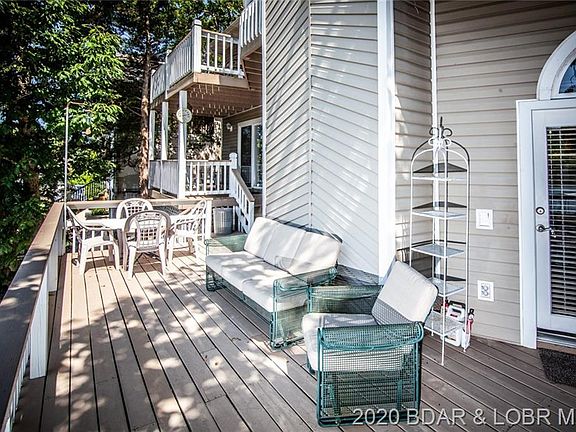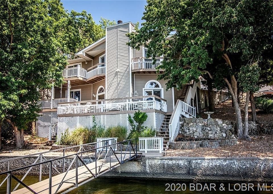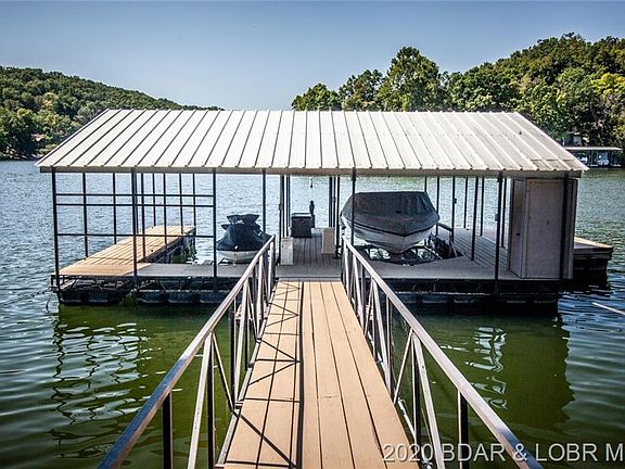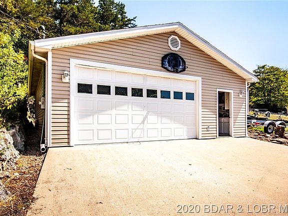 Here is a Buy! 5 Bedroom 4.5 bath Home on 85 feet lake front with a second tier lot that includes 28 X 38' detached garage. Now being used as wood crafting shop. Can be a 4 car garage. The home is located in the protected Woods Cove on the 22.5 mile marker of the Osage Arm of Lake of the Ozarks. Home is centrally located in Osage Beach and close to shopping, grocery stores, GREAT Restaurants and most of all Medical facilities. This home has 2 en suites on the upper level plus 2 more bedrooms and 1 addition full bath. Lower level is main level living that includes Master bedroom with full bath, kitchen, living room, dining area, laundry and powder room. Minimal steps to the lake front and your 2 well dock for fishing, swimming, boating. Home has 2 HVAC's and 2 Water Heaters. Landscaping is low maintenance with no grass to mow. This will not last long.