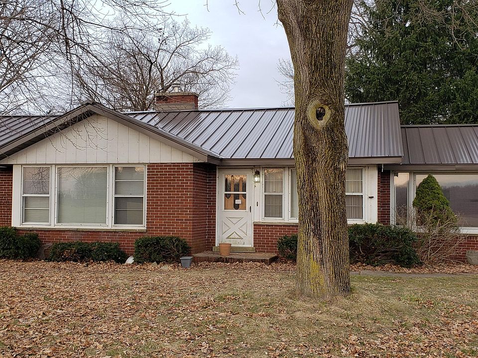 Great Country location just south of town. New Metal Roof Feb 2020 & New Geo Thermo Furnace Summer of 2019! Situated on 5 acres, this brick ranch style home offers 3 bedrooms, 1 full bath, open concept Dining area & Living room w/fireplace plus an updated kitchen w/lots of storage. There is also an adt'l family room done in knotty pine w/ lots of windows offering great view's of the property. The basement could be finished for additional living space and has a fireplace, plus laundry room area. There is 2 car detached garage, large older barn, several small outbuildings plus fenced pasture area w/shelter shed for your animals. Nice size back yard w/shade trees and a chain link fenced area for children or pets off the back of the home.