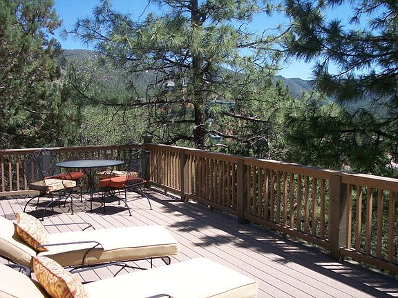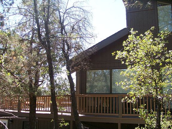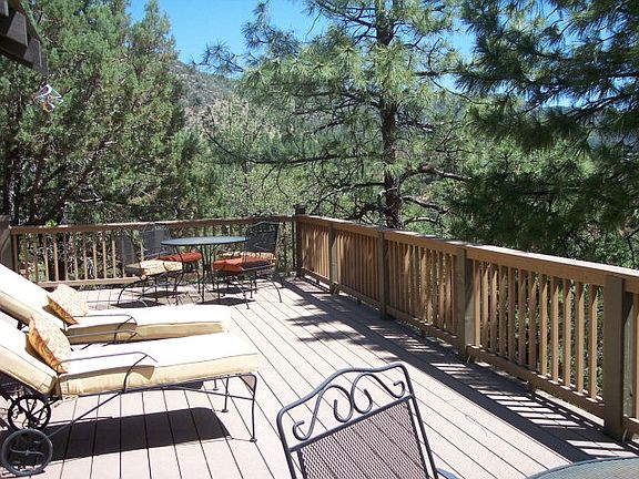 Resort type setting with spectacular views and loads of privacy. The outdoor living space is amazing: The maintenance free back deck is HUGE ( Approx. 40' x 15' ) plus the shaded, native flagstone patio at the front. Nice native stone steps and planter terrassas lead to the front entrance. There is off-street parking for 2 vehicles. The inside is light and bright with windows everywhere facing mostly the East and, therefore, Pine Creek Canyon and the Rim. Beautiful! Cute U-shaped kitchen with breakfast bar. Whitewashed, beamed vaulted ceilings in the living area extend all the way to the loft bedroom and bath which gives this cabin a much larger, spacious feeling than the s.footage would indicate. A floor to ceiling native stone fireplace in the great room competes with the views. A room has been added downstairs ,(accessible from outside only) approx. 170 s.feet, and is currently used as a bedroom with twin beds and other furnishings. Really a fun room and especially nice for kids!