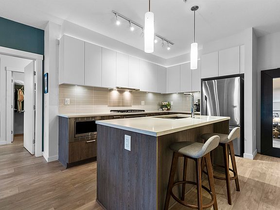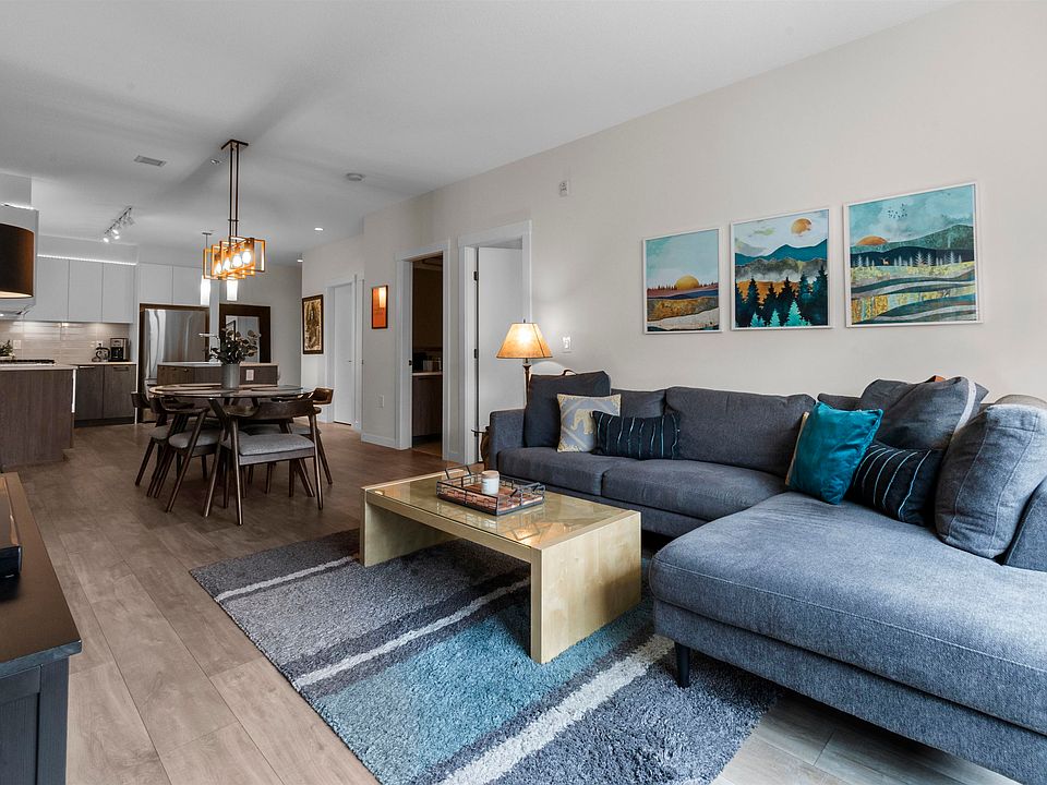 Spacious, open concept, 2 bed + den, 2 bath, 1071sqft corner suite at the Kindred, in the heart of Moodyville. Kitchen features Fisher Paykel fridge, 5 burner gas cook top, soft close cabinets, under-mount lighting and large island. Two separate oversized bedrooms, primary has generous walk-in closet & ensuite with double sinks, separate tub & glass enclosed shower. Enjoy the unique oversized patio with easy walk-up entry makes this unit feel more like a 1-level townhome. The complex offers a building lounge with outdoor terrace, communal green space, and secure visitor parking. Comes w/ 2 parking & storage locker. Pets and rentals allowed. Walking distance to all amenities: seabus, Lonsdale Quay, Moodyville Park, shops, restaurants and more!