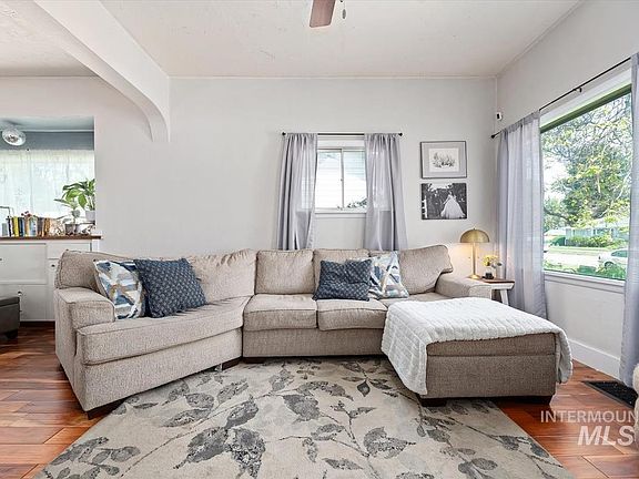 Don't miss this adorable, bungalow-style home located in the Historic District of Nampa. Enjoy your evenings with a glass on wine on the enclosed front porch. The main living area features real hardwood flooring, windows that bring in natural light, and an open concept with the kitchen. Updates include: Remodeled bathroom, new paint, new closets, upgraded electrical panel, extended back yard parking, and RV hookups installed to the back of the lot. With no CC&Rs, this is an ideal lot to park and RV or Tiny Home in the back and still have additional parking space plus a 2-car detached garage! Come make this your new home today! (Tiny Home in Back sold separately. Inquire with listing agent for details).