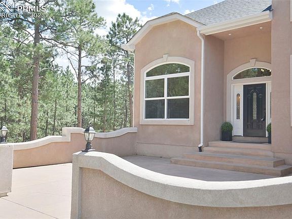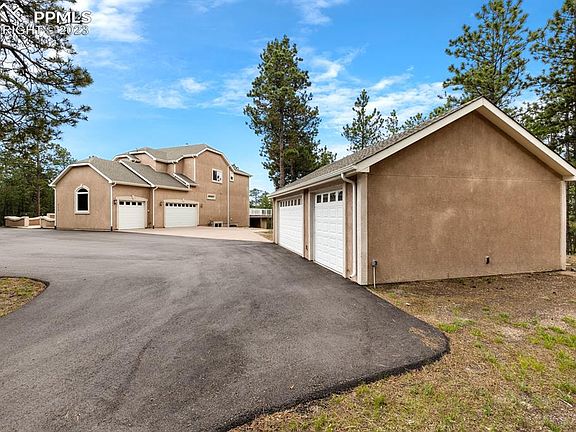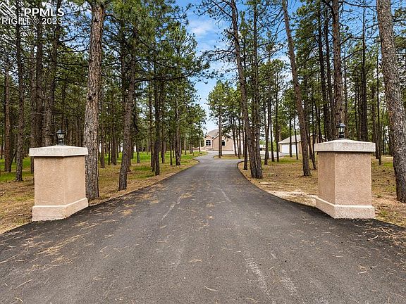 Welcome to your private Colorado haven, where serenity meets luxury and a floor-plan that supports a large family or multi-generational living with it's multiple ensuites AND bar area/kitchen option. Nestled amidst mature pines on a fire-mitigated 2.5-acre lot, this custom home boasts sweeping vistas of the Front Range, Pike’s Peak, and the Air Force Academy. With a new roof installed in Aug 2023, you can revel in the spacious open-floor plan with soaring ceilings and main floor living. The foyer welcomes you to the study, cozy living room with a warm gas fireplace, and a formal dining room. A gourmet kitchen features new quartz countertops, ample cabinetry, a pantry, and top-tier appliances including a built-in 5-burner gas stove, double oven, and expansive refrigerator/freezer and connects to the dining room via the Butler’s Pantry. Retreat to the main floor's owner's suite with its own fireplace, spacious walk-in shower, and stand-along tub. A spacious 3-car attached garage is just off the kitchen, complemented by a 38x25 detached 3-car garage for hobbyists or extra storage. Walkout to the expansive deck and immerse in the all-season Cal-Spa swimming pool/hot tub. Bask in unparalleled views of Pikes Peak from the secondary upper suite, boasting a sitting area, dual-sided fireplace, ensuite with bath and steam shower, complete with a mini-fridge and prep-sink. The finished walkout basement is ready for entertainment, and adorned with a pub-sized wet bar for jovial gatherings. Benefit from a central vacuum system, 65-gallon "Flex 2" water pressure booster, dual gas self-cleaning water heaters for instant water heating, and two "Quite 80 Furnaces" paired with central air conditioning for optimal comfort. Dive into this secluded gem where adventure and relaxation await. Enjoy the perks of NO HOA, low taxes, and a commendable school district. While enveloped in tranquility, you have the convenience of being merely 7 minutes away from I-25.