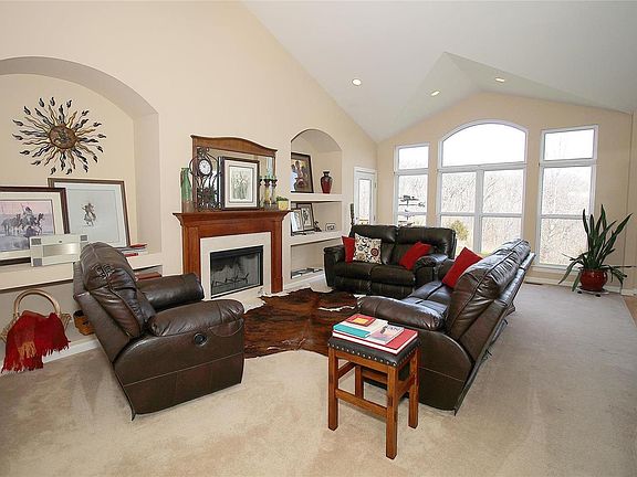 Open, spacious, flooded w/natural light, a few words to describe this wonderful 2 bed/3 bath/2 car ranch villa w/beautiful soaring vaulted ceilings! Main level offers vaulted great rm/kitchen/breakfast/formal dining. Kitchen w/center island/breakfast bar/pantry/double ovens & wood floors. Wall of windows across back offers a serene view of a level yard backing to common ground w/trees and small lake. Family room opens onto deck. Den possible 3rd bedroom. Main floor laundry. Master suite w/14ft tray ceiling, great views/walk-in closet/master bath w/double vanity, separate tub & shower & private toilet area. Spacious finished w/o LL includes family/recreation rm that walks out to patio, bedroom w/walk-in closet, full bath and plenty of room for storage. Many upgrades including double vaulted ceilings/bay windows/wood burning fireplace/hardwood floors, built in shelves, deck, new roof, neutral deco. AAA rated Rockwood Schools/Close to Highway 44/Amenities include neighborhood pool.
