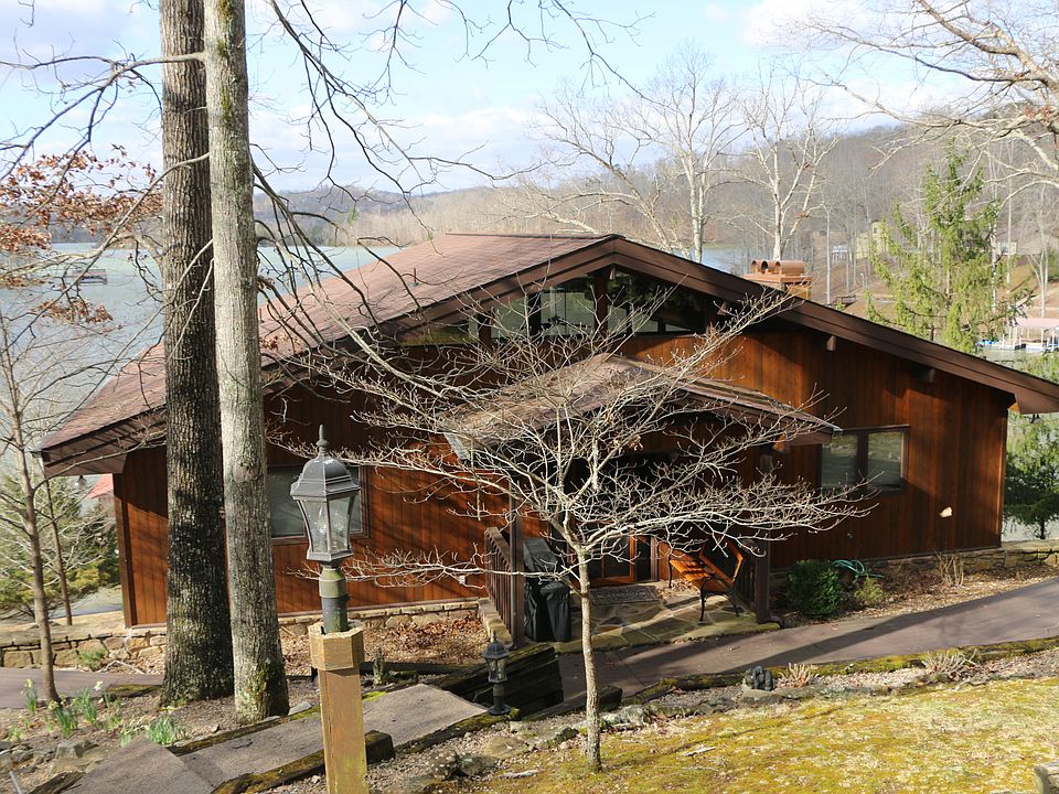 Lakefront dreamers, look no more! Idyllic cove with deep year round water looks across to undeveloped waterfront treeline near the Sugar Hollow side of Deerfield Resort. Soaring tongue and groove cathedral ceilings over expansive kitchen, dining and great room with wall to wall, floor to ceiling lake views. Walk-out decks from great room and family room which both have fireplaces, bonus rec room, large laundry / utility storage, 1st floor master all on a gently sloping lot with a shed and good off-street parking, as well as a double -slip covered dock, hot tub and furnishings negotiable separately