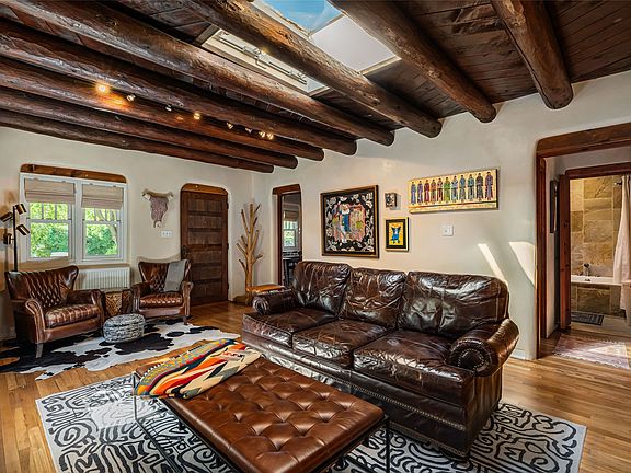 A rare Santa Fe gem – this adobe sanctuary on an oversized lot offers seamless indoor-outdoor living with a fully fenced wraparound yard. Stacked stone walls, wooden gates, a grapevine-covered arbor, and fragrant landscaped gardens create a serene setting where every window frames natural beauty. Inside, renovations preserve authentic adobe character while introducing a fresh, contemporary feel. Skylights brighten the kitchen, and the spacious great room with French doors to the courtyard is ideal for entertaining. The floor plan includes two bedrooms, a full bath, powder room, large laundry room, and a flexible study or dressing room off the primary suite. A private downstairs space provides additional storage or the opportunity for a refinished retreat. Nestled at the heart of the Railyard District, just blocks from Joseph’s Pub, Mille, Dolina, Paloma, and minutes to the Plaza, this calming home combines timeless Santa Fe charm with modern updates and unbeatable location.