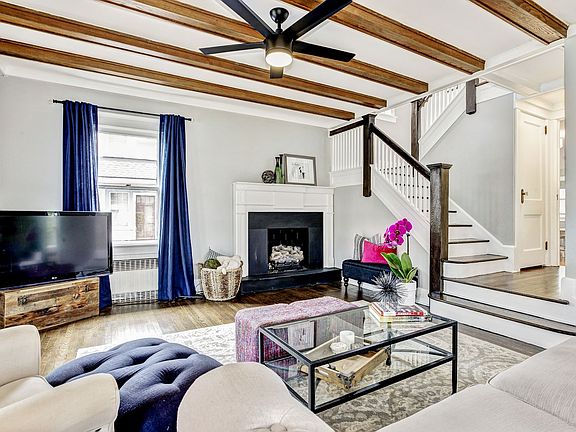 *CLICK ON VIRTUAL TOUR* Steps to the NYC Train and Bus, Downtown, Restaurants and School, this beautiful 5 BR Colonial has both modern updates and 20th Century charm to spare! Flooded with sunlight, the bright 3 season porch greets you as you enter this home. With recently refinished hardwood floors running throughout the house, the 1st fl boasts a large living room featuring a gas fireplace and french doors leading out to the front porch. The dining rm is oversized and perfect for gatherings, with french doors opening up to the back deck and yard while the newly updated kitchen has SS appl. and a lovely breakfast nook. The 2nd fl offers 4 BRs, an updated full bath w tub, and plenty of closet space. The 3rd fl includes a large updated full bath- perfect as a master suite, playroom or office. Complete with a cedar closet, the possibilities for this space are endless! The basement is partially finished with a laundry area, 1 2 Bath, and lots of storage space. Welcome home!