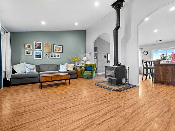 Seller offering $3,000 credit with acceptable offer for buyer desired upgrades. Newer turn-key home on almost 2 acres with all public utilities! A cute and covered front porch will escort you into the livingroom of this inviting home, which features vaulted ceilings and plenty of light. There is a certified wood stove, and also central air and heat to stay comfortable in your new home. The split floor plan is perfect for anyone needing a little privacy. The primary suite includes a small office space, two walk in closets, a jetted tub, shower, and two separate vanities. There is plenty of parking on the generous lot, including two large covered parking areas in the rear. Come see for yourself!
