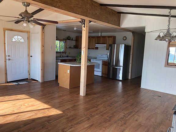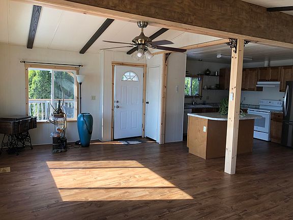 Well maintained manufactured 2 br, 2 bth home with oversized dbl car garage with work area. Remodeled kitchen, flooring, appliances and wood stove, all two years old including hot water heater, windows and plumbing through out. big closets lots of storage and built-ins. Eco laundry system. Wood shed holds 1.5 cords. Enclosed covered deck with pop up wind block. Wonderful southern exposure garden area. Mature Landscaping