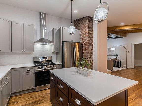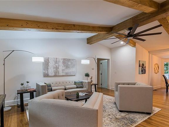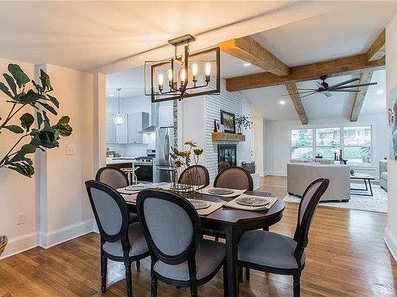 This home boasts valuted ceilings in the main living area w/ custom wood beams, original hardwood floors, brick-front wood burning fireplace, beautifully renovated kitchen with quartz countertops, original brick accent, shaker style cabinets. A large kitchen island for entertaiing with a separate dining spacewith french doors that opens and provides views to the large back yard. There is plenty of outdoor relaxing space either on the front porch or back deck. This house is also only blocks away from a walking trail that connects to the beltline.