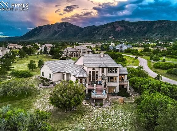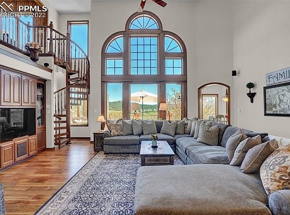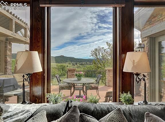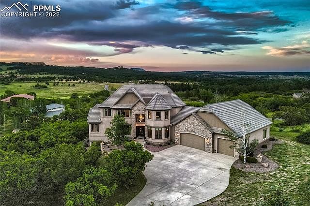 Architectural beauty on almost 3 acres! Panoramic views from every window including views of the Palmer Lake star. Main level living - primary suite on main! The setting is stunning! Quality, one of a kind custom 2 x 6 construction, lovingly maintained, with privacy, seclusion & luxury in mind. This is the perfect home for hobbyist or car collectors. 1720 SF heated, finished garage with silent door openers & car lift included offering space for 7 cars or lots of toys! Oversized, expandable doors at walk out lower level provide easy access to unfinished hobby/craft area. The stately 2 story turret welcomes you to step in to a dramatic, curved staircase. A private home office & 2 story main living area will delight you! With the owners retreat, laundry & garage all on the main level, you can experience true single level living. Cherry cabinetry, 3 gas log fireplaces & newer Acacia wood flooring & carpet, 2 new furnaces w/ humidifiers & A/C. Chef's dream gourmet kitchen with large island, granite countertops, loads of storage/counter space, all stainless Bosch appliances, convection oven, electric induction Jenn-Air range & new microwave. Easy access to butler's pantry from formal dining room. Breakfast nook in 2nd turret with walk out to 2 tiered deck offering comfort & style for easy outdoor entertaining. Composite decking, outdoor speakers & tempered glass wind protection for year round use. The lower tier of the deck is a sun deck with clear glass see-thru panels & metal railings. Owners retreat includes a private deck to enjoy the stunning setting, 5 pc bath with an oversized shower & jetted tub, a large walk in closet with custom built in's & a hidden safe. Upper level features 2 roomy junior suites, a loft with spiral staircase providing a secondary access & wood accents for a cozy "mountain cabin" feel. The walk out lower level features 9' ceilings, 4th bedroom, wet bar/second kitchen, game area & rec room + bonus room. Small, fenced area for littles or pets.