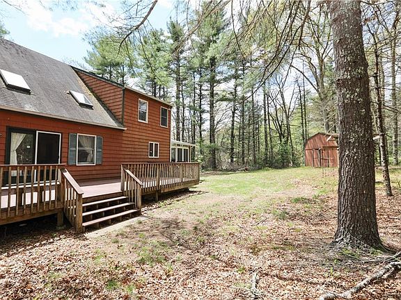 Neat saltbox colonial, vaulted ceiling living room with brick fireplace. Master bedroom has half bath. Two additional bedrooms and full bath with tub on second level. First floor formal dining, kitchen has island with stove. Sun room off kitchen. Great deck overlooks two wooded acres. Needs some love.
