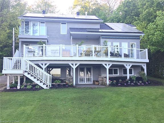 Welcome to paradise with over 3000 square feet of premium living area and 73 feet of sandy shoreline all located on a sheltered bay on Georgian Bay. Open concept living features a dream Chef's kitchen finished in maple and glazed in soft white complete with granite countertops and an 11' Island. Surrounded by luxurious finishes such as hickory hand scraped 7" plank flooring with a 5' compass, Napoleon fireplace, cozy and warming radiant heat and cathedral ceilings. 4 Bedrooms including a spacious master bedroom with private balcony to enjoy the panoramic view of Georgian Bay. Spa-like ensuite with heated tile, custom maple glazed espresso vanity/quartz counter and custom glass shower with rain head. Fully finished walk out lower level with large family room would make for a perfect in-law suite. Manicured grounds lead you to the sandy beach that features new cedar docks for swimming and boating. An insulated Bunkie would make an awesome home Office or accommodate extra guests. Experience the dream of waterfront living in this private oasis with thousands of acres of Georgian Bay as your playground. Transferable Solar panel system owned.