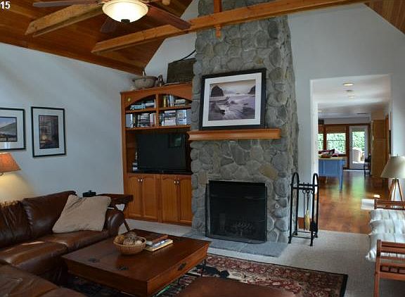 Located on the north end of Cannon Beach with great spaces indoors and out. This three plus bedroom/2.5 bath home features an open spacious kitchen, dining, family room with access to the large deck & backyard. Vaulted wood beam ceiling with gorgeous towering rock fireplace. Master suite w/walk-in closet, extra room for a den or office plus loft area workspace. Beach access is a short walk away.