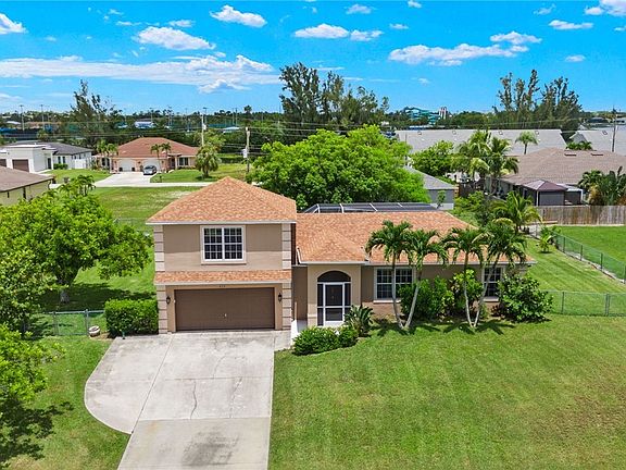 BRAND NEW A/C! Discover this stunning 3-bedroom, 2-bathroom pool home situated on an OVERSIZED LOT! Featuring a 2-car garage with an expansive driveway for additional parking. Located in the vibrant heart of Cape Coral, this residence is ready for move-in with a 2018 Roof, granite countertops, updated kitchen cabinetry, updated bathroom vanities, and much more. It boasts a separate master suite above the garage. Delight in the mesmerizing saltwater pool, complete with modern amenities: updated remote-controlled LED lighting, Pentair Ultra Temp Heat Pump, Intellichlor power center, Intelliflow VSF pool pump, Easy Touch PSL4 internet control system, and two electronically controlled three-way valves. The home is adorned with plank-like tile across the main living spaces and bathrooms, comprehensive window treatments, a screened entryway lanai, and a full pool screen enclosure. Flood Zone X! The expansive yard, featuring a fire pit, is ideal for children and pets. Easy access to shopping, restaurants, schools, Rt-41, I-75, RSW Airport, beaches, and more.