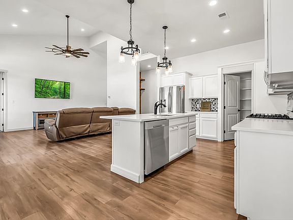 - Ceiling Fan(s), Separate/Formal Dining Room, Granite Counters, Main Level Primary, Pantry, Vaulted Ceiling(s), Walk-In Shower, Window Treatments