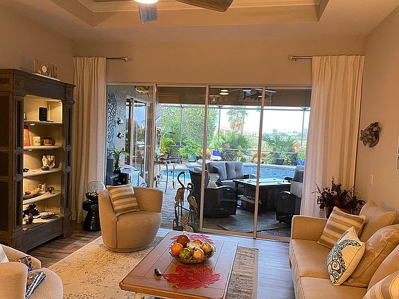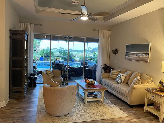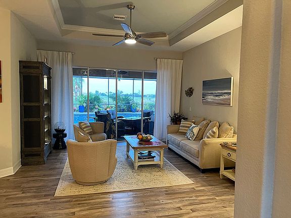 COUNTRY CLUB GOLF MEMBERSHIP INCLUDED! This immaculate split plan, 4 bedroom, 2.5 bath, Bayhill floor plan home, is perfect for all age groups. The grand master suite boasts a morning room, generously sized walk-in closet, dual vanities and on suite bath fully remodeled in 2020. Master bath features features oversized walk in shower. Also of note, are the spacious living room, separate dining room and family room, and eat-in kitchen. Enjoy your spectacular golf and lake views from many rooms, or, while sitting on your lanai, or soaking in the hot tub! This is a golf-course-frontage lot, with golf and lake views, of the third hole on the Estuary course! This golf community has a 27-hole championship course designed by Arthur Hill, 8 Har-Tru tennis courts with on-site pro shop, a beautiful 39,000-square-foot clubhouse with state-of-the-art fitness facilities, resort-style pool and spa. This property is conveniently located near I-75, shopping, restaurants and beaches! This community is also located in the highly sought after school zones. Lawn and gardens are maintained by HOA. Home upgrades completed in 2021 include: complete renovation of pool and spa (salt water, new tile, new pebble tech resurface, smart phone control for pool, spa, and led color changing lights, new spa/pool heat pump), deck pavers added to screened in porch, newly installed smart controlled hurricane screen, New high end laminate flooring floor throughout house, New Refrigerator, Freshly painted interior, Resurfaced kitchen cabinets, updated ceiling fans and lighting throughout the house, replaced vanities in guest bathrooms. This is a must see. Call Pat at 717-805-9756 for appointment.