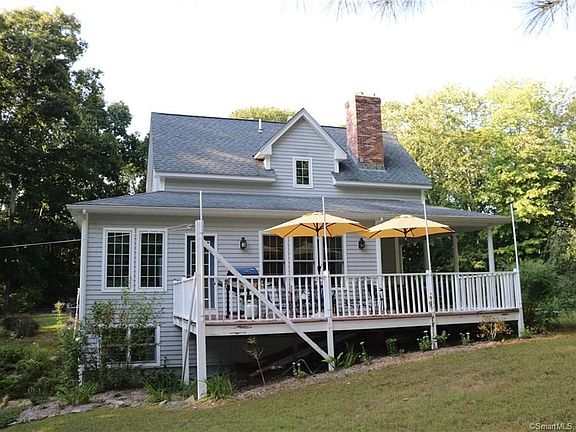 Peace and privacy on this lovely 4.7 acre lot. House is set back off the road among the trees and has a large wrap around deck that is covered in the front and open at the side of the house off the den. Front entry has a 2 story foyer that leads to living room with brick fireplace. Living room is open to the kitchen and dining room. Year round sunroom has builtins, tile floor and atrium door to the deck. First floor master has full bath. There are both Hardwoods and tile flooring throughout main level. 2 bedrooms and full bath on upper level. Lower level has plenty of storage and large family room with slider out to back yard. Family room has hot water baseboard heat and upper levels are Forced Warm Air. . Buderus boiler. Central air and central Vac. Large shed and nice plantings.