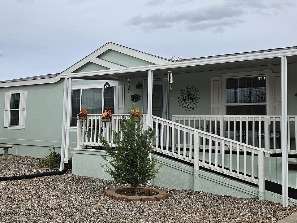 This lovely home offers that peaceful, easy feeling that we are all looking for!!! Very clean and well maintained. 3 bedroom, 2 bath. Large, comfortable rooms in this 1,512 square foot split floor plan home. Walk in pantry, utility room with additional space for a freezer or even more storage. Front (with Ramp) and rear covered decks. Premium, spacious lot with small area of chain link in back yard. Pum Crete ( formed concrete) type skirting. Large shed with three nicely done additions. Easy care landscape using primarily the Xeroscape style. This really is a nice one! The park is gated and offers two club houses. Outdoor pool, indoor pool and spa. Welcome home!