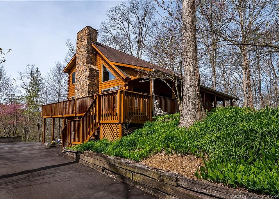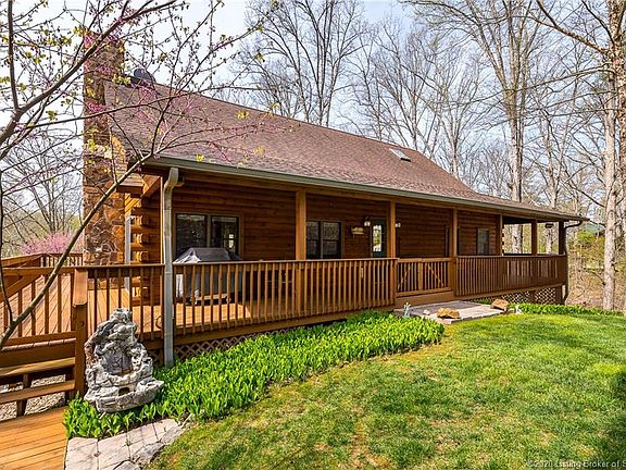 Your own PRIVATE RETREAT! The feel of Gatlinburg, nestled in the Knobs of Southern Indiana. This 3 bedroom, 2 1/2 bath home stands among the natural beauty of a nicely wooded 1.36 acre lot. The unique styling of a LOG HOME, brings the outside....indoors. Enjoy this secluded setting, with mature trees, lovely landscaping, all from the wrap around porch. Gorgeous kitchen with stainless steel appliances, massive breakfast bar, ample storage, and open floor plan that looks into the roomy living area with stunning fireplace. Master suite and bath, located on the first floor, exceeds expectations with a luxurious soaker tub, walk in closet, expansive vanity area and shower. Laundry room is conveniently located on the first floor, tucked away behind a pocket door off the half bath. Upstairs boasts two bedrooms and a full bath, located adjacent to the loft style bonus area. Rear entry two and a half car garage, and a utility room/ workshop located in the basement with a private entrance. The seller has taken meticulous care of this home, and has updated many items including Quartz Countertops in Kitchen and Master Bath(2019) New Living Room Carpet(2019) New Sinks and Faucets in Kitchen & Master Bath(2019), HVAC(2018), Water Heater(2015), Water Softener(2017), Roof(2012), New Driveway(2019). Access to Neighborhood/Lake events, 70 acre private lake, beach, boat dock, picnic area, and playground. Trolling motor boats only. Seller is offering 1 year home warranty.