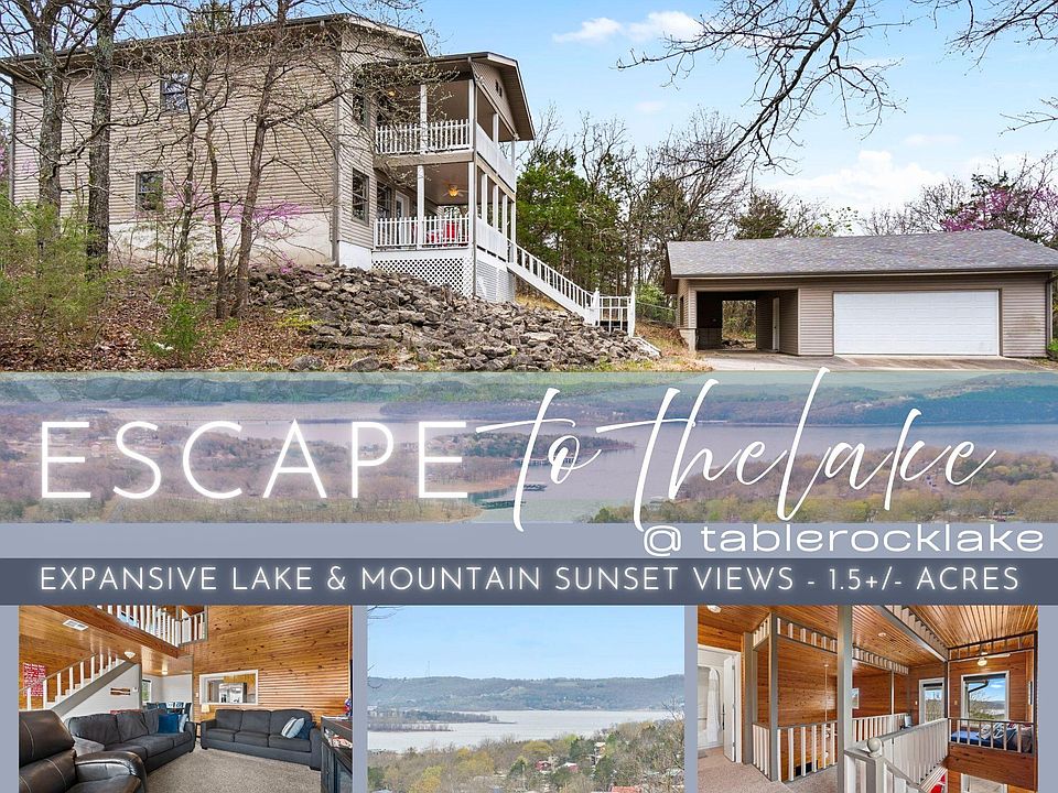 Now you can truly have your cake & eat it too @615 St Hwy P Hwy in lake loving Hollister, MO. Just in time for summer & minutes away from Big Cedar Lodge & State park Marina is the offering of this incredibly private, lake view & city close, iconic Table Rock nature retreat ready to be the center of your summer lake season! Tucked away on a pristine 1.5+/- acre hillside @ #tablerocklake, boasting stunning sunset lake & mountain views, rests this exceptionally private, gated lake escape w/ ample room for all the guests & lake toys. The inside deets: step inside to spacious open flowing floor plan w/sky high nostalgic wood ceilings offering you that warm 'bigcedaresque' feel complete w/a window wonderland of natural light, a home chef's kitchen w/stainless appliances, pantry, & ample storage & meal prep space. The main level also offers a bright/airy main bed w/gorgeous ensuite, laundry, & one of two covered decks to step out to feel the cool lake breezes & soak up the endless lake/mountain views, dramatic weather events & may be a rainbow or two watching the boats zipping by. Back inside take the tribe up to two more XL bedrooms, second full bath &, personal favorite, cozy lake view reading nook w/walk out to covered deck space. Bonus! Furniture package avail for add. 20k to make it 'easy peasy lemon squeezy'. Need more room for kiddos & fur babies?! Head outside to spacious fenced backyard w/ blooming hardwoods & evergreens for year round enjoyment perfect for endless yard games/star gazing, bbqs, etc. What the lake toys?! Detached two car garage w/attached carport offers ample storage/workshop space. Further home features:water filtration system, private well, ADT security, & more. And the location! Approx 10 min to quick/easy lake access at popular State Park Marina, 6+/-min to Big Cedar Lodge/Top of the Rock Golf Course, & Branson w/world class dining/entertainment,& endless shopping. Summer is calling & new cherished memories @615 St Hwy P, Hollister.